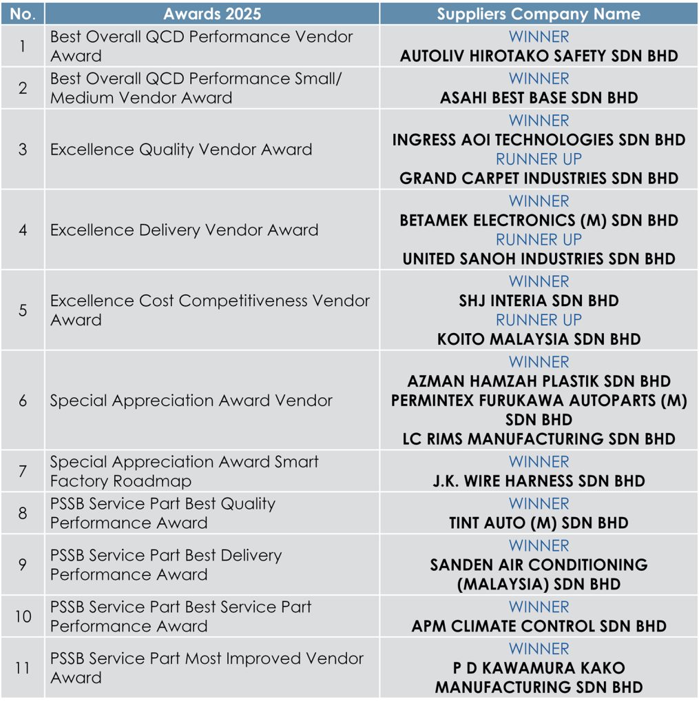 As usual, the highlight of the annual dinner was the presentation of Perodua Vendor Annual Awards, which carried a very attractive theme this year. A total of eleven (11) award categories were presented, and the list of winners is as follows: